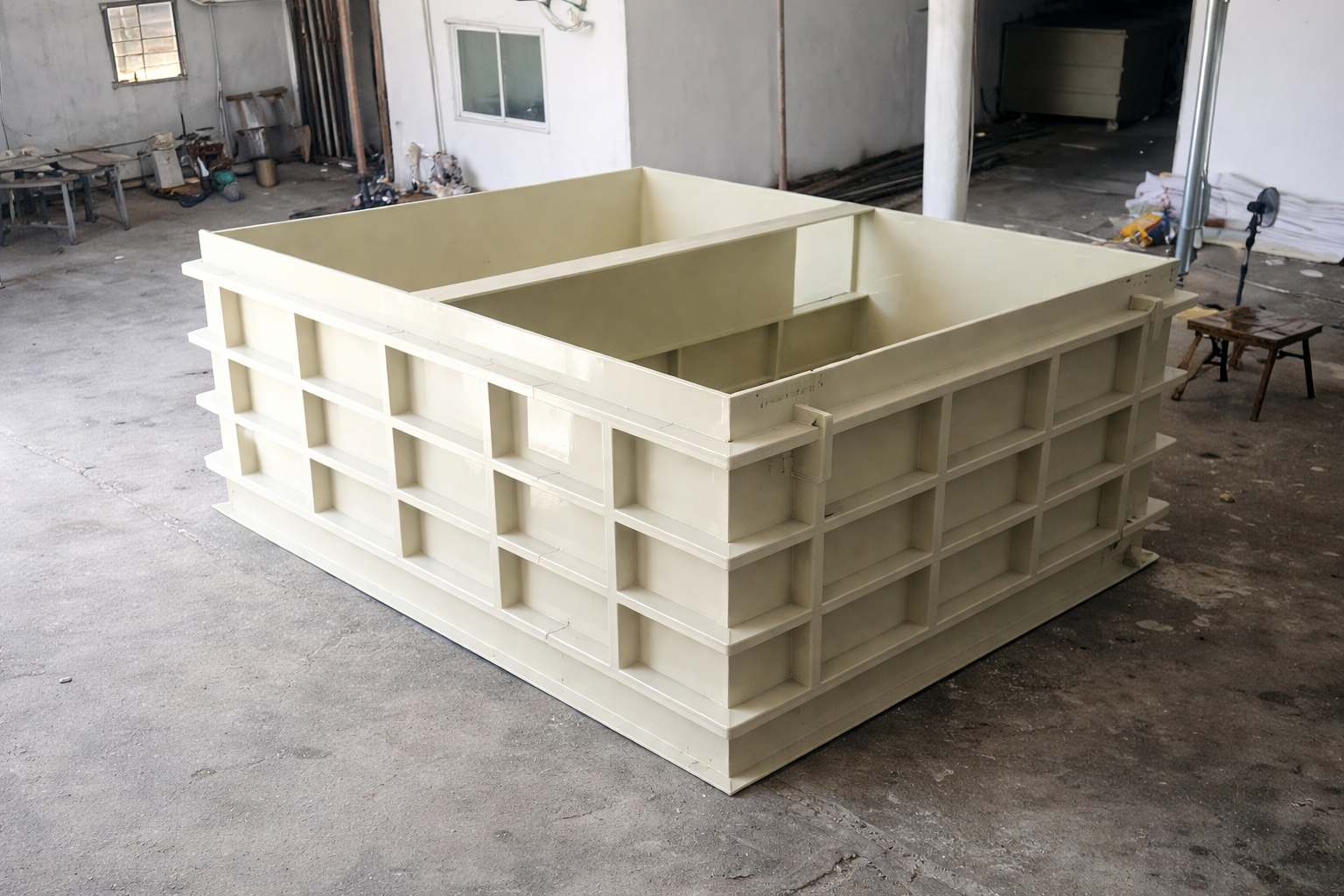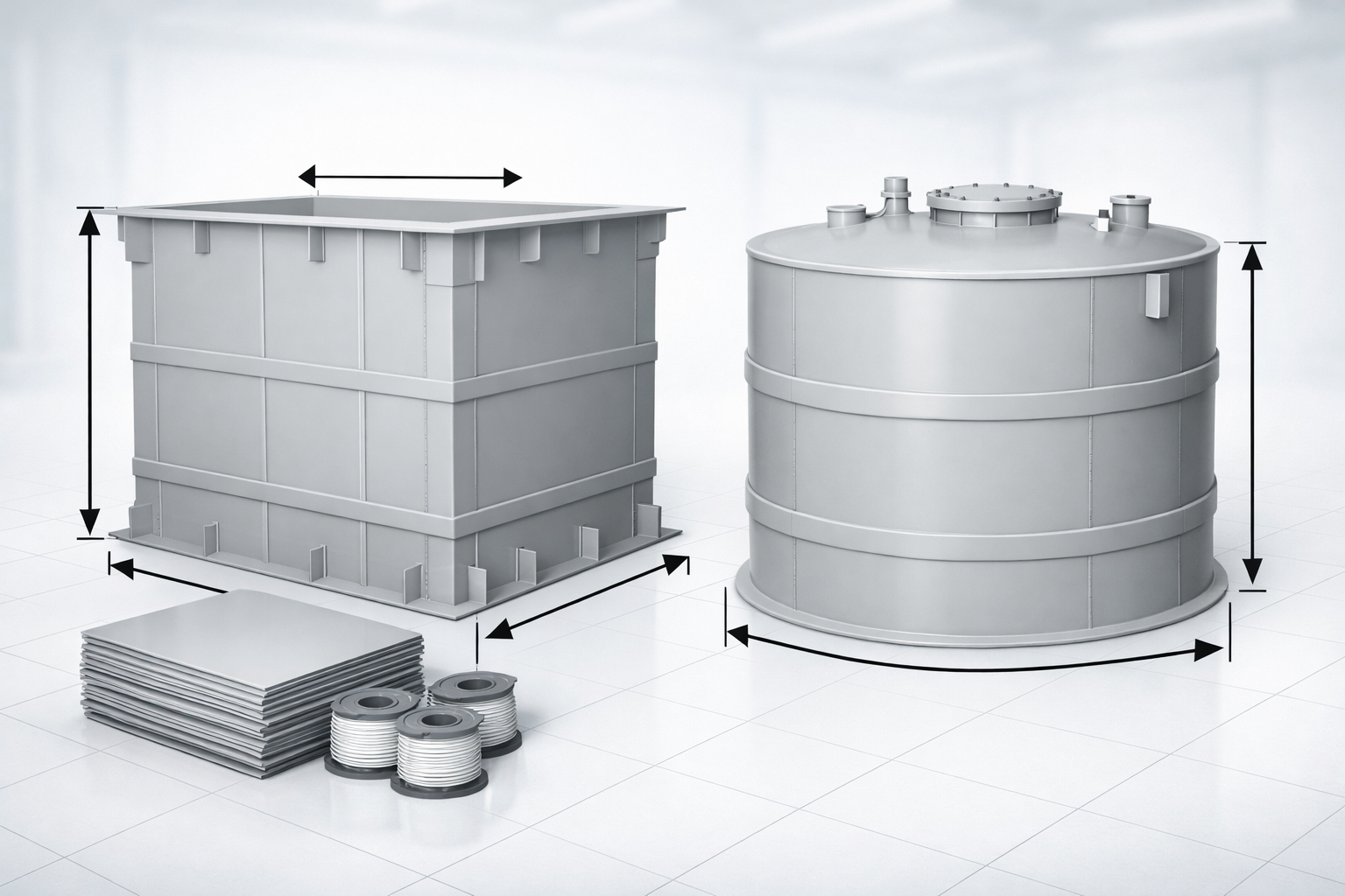 Kích thước bồn bể PP xác định diện tích bề mặt tổng cần gia công — từ đó suy ra khối lượng tấm PP tiêu hao. Đây là mối quan hệ trực tiếp và minh bạch nhất trong ba trụ cột định giá. Tuy nhiên, không phải mối quan hệ tuyến tính đơn giản: thể tích tăng gấp đôi không có nghĩa là chi phí tăng gấp đôi — nhờ kinh tế theo quy mô và tối ưu hình học.