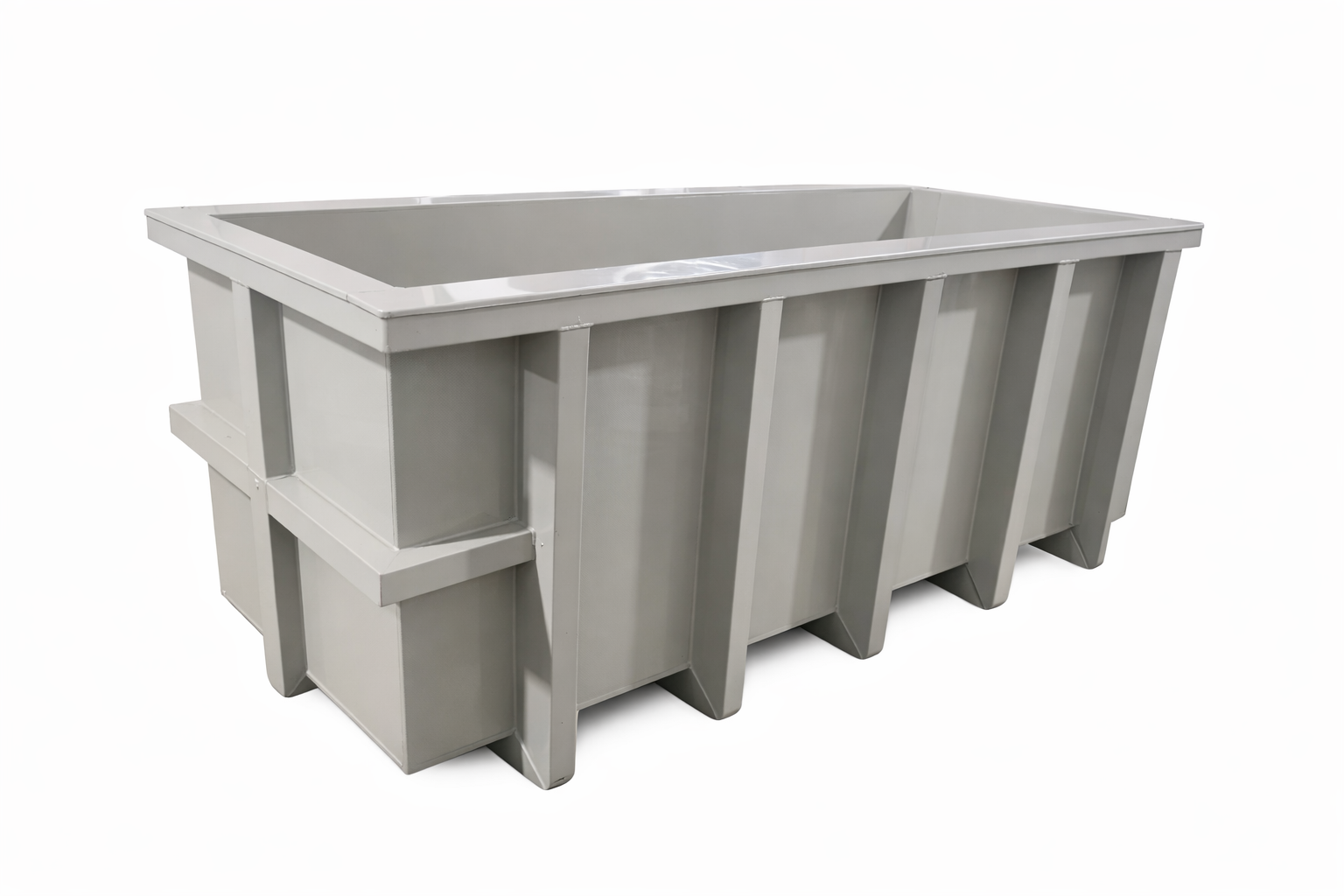 Bể PP được chế tạo từ tấm PP ép đùn (extruded PP sheet) dày 3–60mm, hàn thành kết cấu 3D bằng phương pháp hàn nhiệt khí nóng (hot gas welding) theo tiêu chuẩn DVS 2207-4 (Đức) — tiêu chuẩn kỹ thuật hàn nhựa được công nhận rộng rãi nhất thế giới.