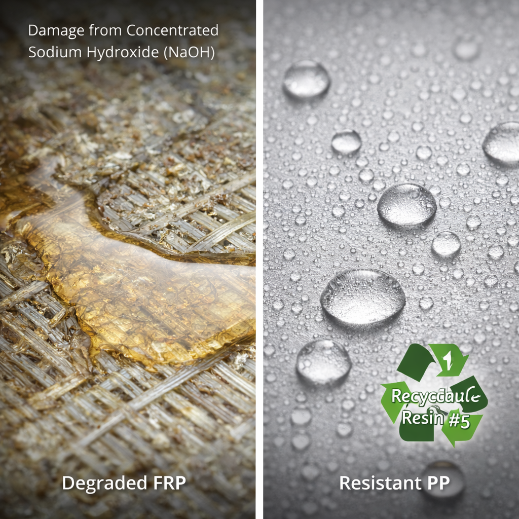 Đây là ưu điểm phân biệt rõ nét nhất của PP so với FRP. Trong môi trường kiềm đặc (NaOH >30%, KOH, Ca(OH)₂ bão hòa), nhựa nhiệt rắn trong FRP (kể cả vinyl ester và epoxy) bị thủy phân (hydrolysis) và phân hủy dần theo thời gian, đặc biệt khi có nhiệt độ: