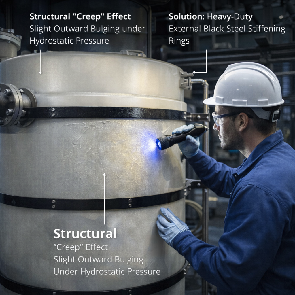 Như đã đề cập, nhựa nhiệt rắn làm nền FRP bị thủy phân bởi kiềm đặc và nhiệt độ. Đây là giới hạn vật liệu học cơ bản, không thể khắc phục bằng cách tăng chiều dày hoặc cải thiện quy trình chế tạo. Giải pháp duy nhất là sử dụng cấu trúc Dual Laminate (lớp lót PP/PVDF bên trong + kết cấu FRP bên ngoài) – nhưng chi phí tăng đáng kể và phức tạp về kiểm tra chất lượng.