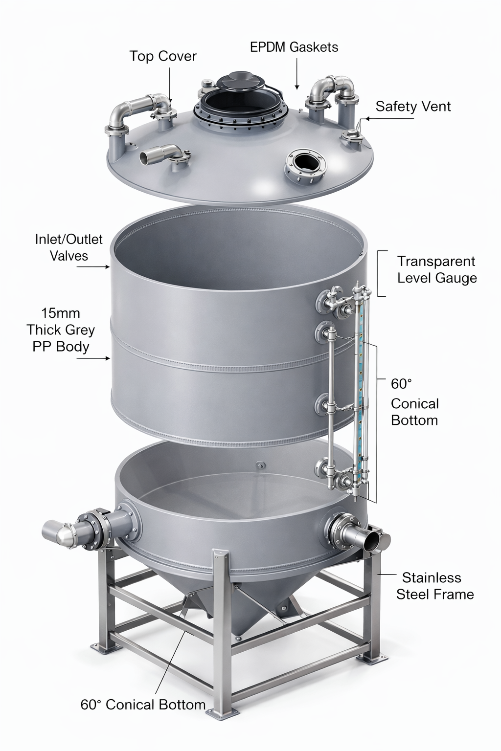 Bồn nhựa PP có cấu hình tạo ra nhiều thành phần được thiết kế đồng bộ để đảm bảo độ bền và an toàn trong quá trình sử dụng.