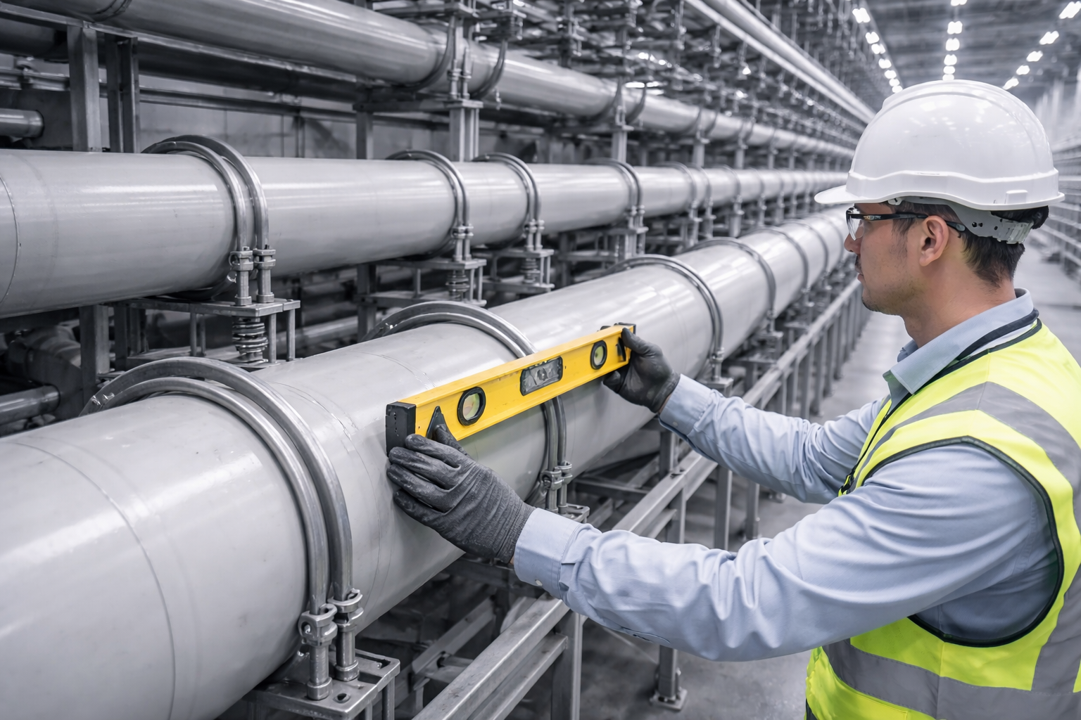 4 — Lắp đặt gối đỡ đúng khoảng cách theo bảng, đúng vật liệu PP-lined: Khoảng cách gối đỡ ống PP ngắn hơn ống thép 2–3 lần — không áp dụng kinh nghiệm ống thép cho ống PP.