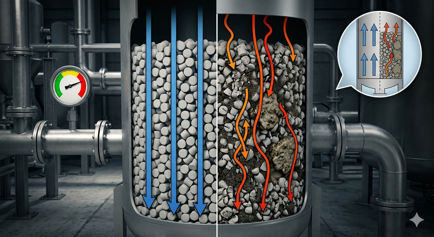 - Kênh dòng khí/lỏng (gas/liquid channeling): Dòng chảy tập trung vào một số vùng thưa của lớp vật liệu → hiệu suất hấp phụ sụp đổ dù ΔP thấp