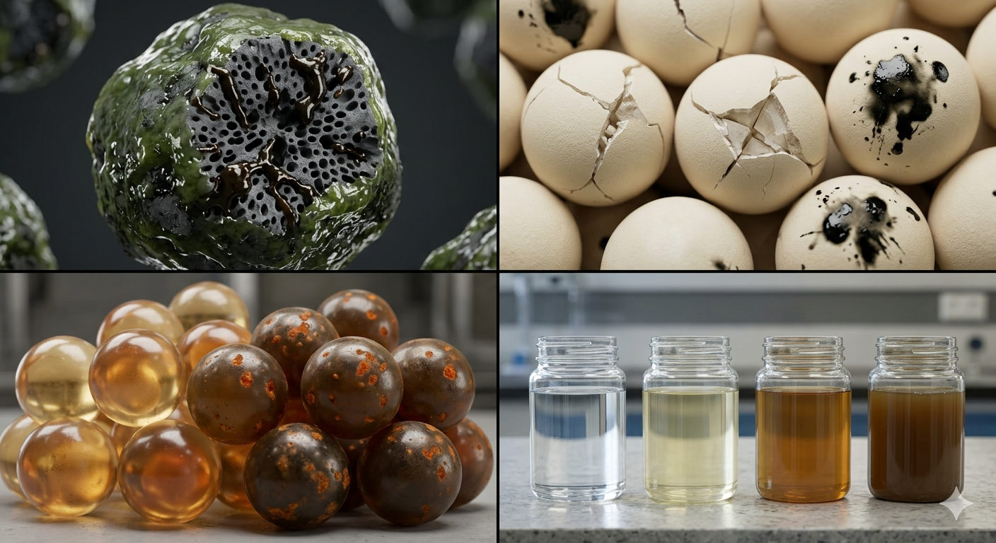 - Hao mòn hóa học (chemical degradation): Nhựa trao đổi ion bị oxy hóa → nứt vỡ hạt; zeolit tiếp xúc acid/base mạnh ngoài dải pH thiết kế → phá hủy cấu trúc tinh thể