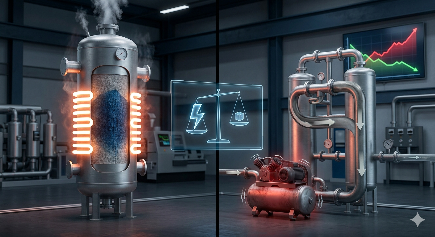 Biểu hiện: Năng lượng gia nhiệt (trong TSA) hoặc năng lượng nén khí tái sinh (trong PSA — Pressure Swing Adsorption) tính trên đơn vị lưu chất xử lý tăng > 20% so với thiết kế hoặc so với baseline vận hành.