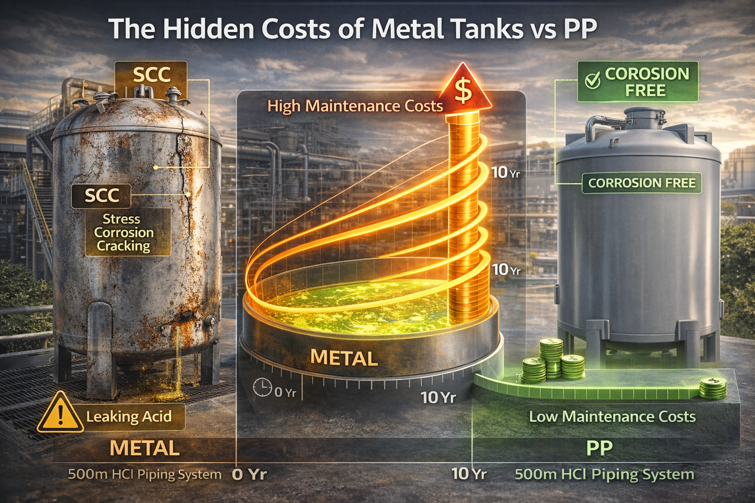 Thực tế vận hành tại các nhà máy hóa chất và mạ điện cho thấy bể kim loại thường rơi vào vòng xoáy chi phí bảo trì leo thang (escalating maintenance cost spiral):