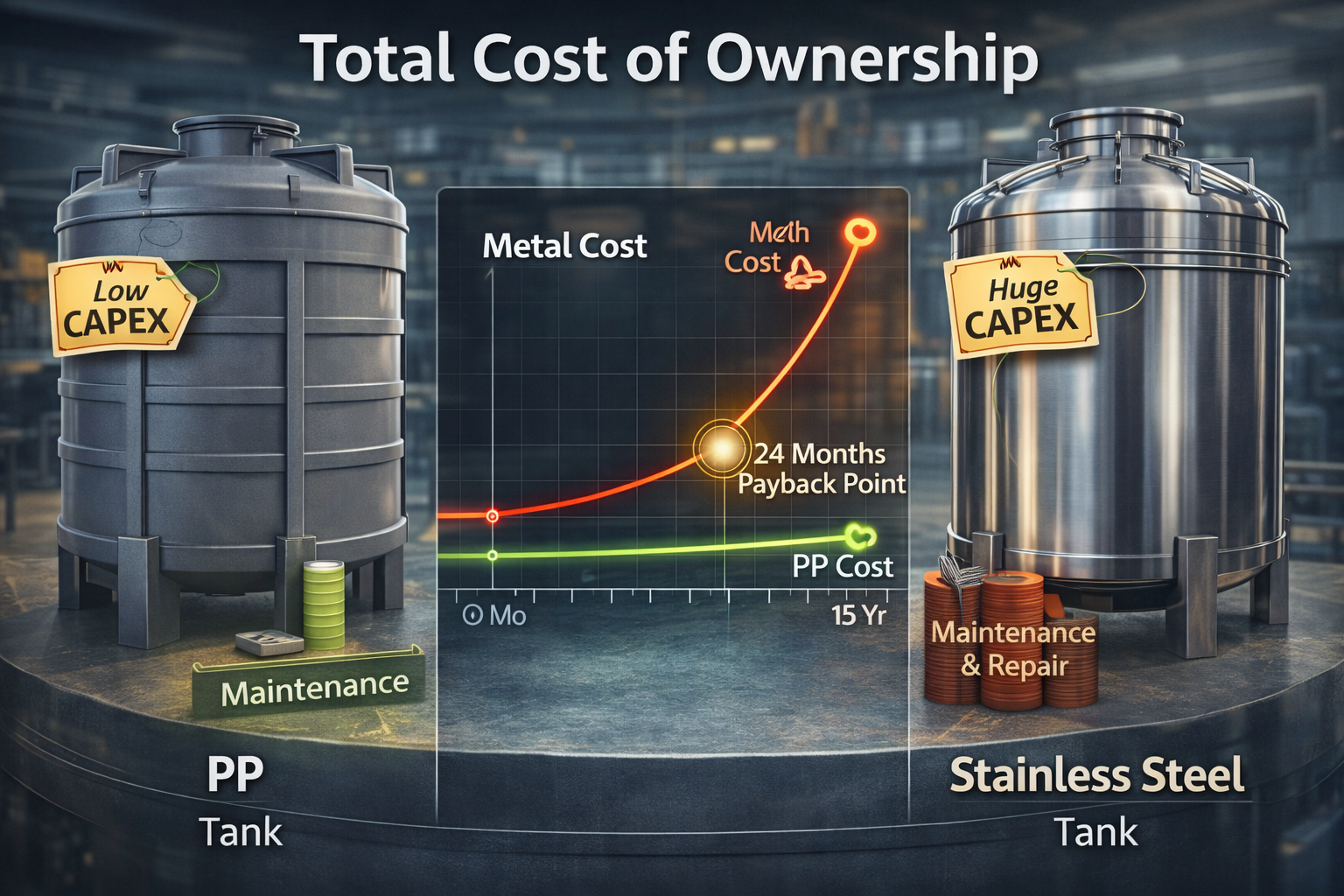 Tiết kiệm từ thay thế = ΔOPEX bảo trì + Δ Chi phí dừng sản xuất + Δ Chi phí thay bể sớm (do tuổi thọ PP dài hơn)