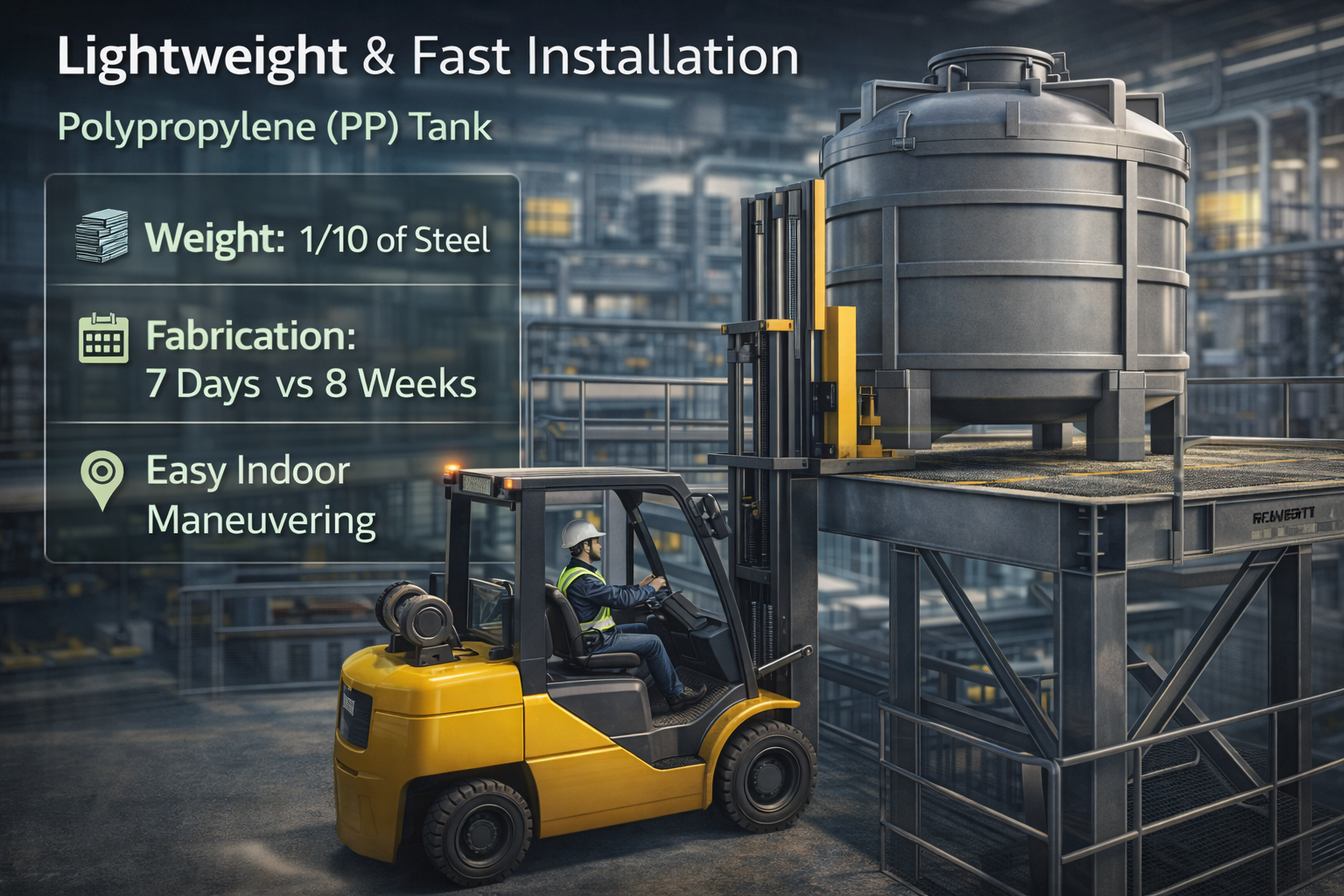 Với trọng lượng riêng PP = 0,90–0,91 g/cm³ so với thép không gỉ 316L = 7,90–8,00 g/cm³, một bể PP điển hình có khối lượng vỏ bể chỉ bằng 10–12% bể thép không gỉ cùng thể tích. Lợi thế này tạo ra hiệu ứng lan truyền nhiều tầng: