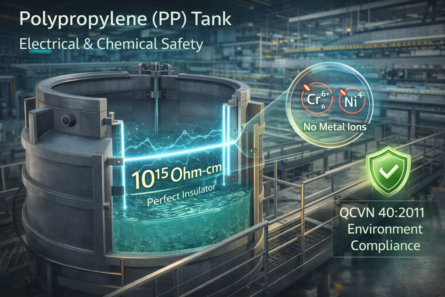 Bể PP với điện trở suất thể tích ~10¹⁵–10¹⁶ Ω·cm loại bỏ hoàn toàn tất cả các rủi ro trên, cải thiện đồng thời hiệu suất điện phân (Faradaic efficiency) và an toàn điện cho người vận hành.
