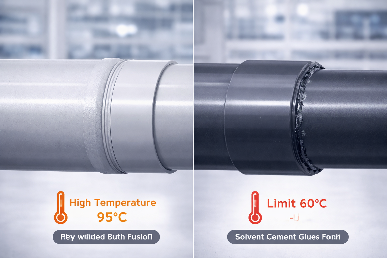 Hạn chế 1 — Giới hạn nhiệt độ thấp: PVC-U mất độ bền đáng kể ở nhiệt độ > 60°C và không được khuyến nghị cho ứng dụng nước nóng liên tục. Nhiều hệ thống nước nhà máy có nhiệt độ 50–80°C (nước CIP, nước rửa thiết bị nóng) — PVC-U không phù hợp.