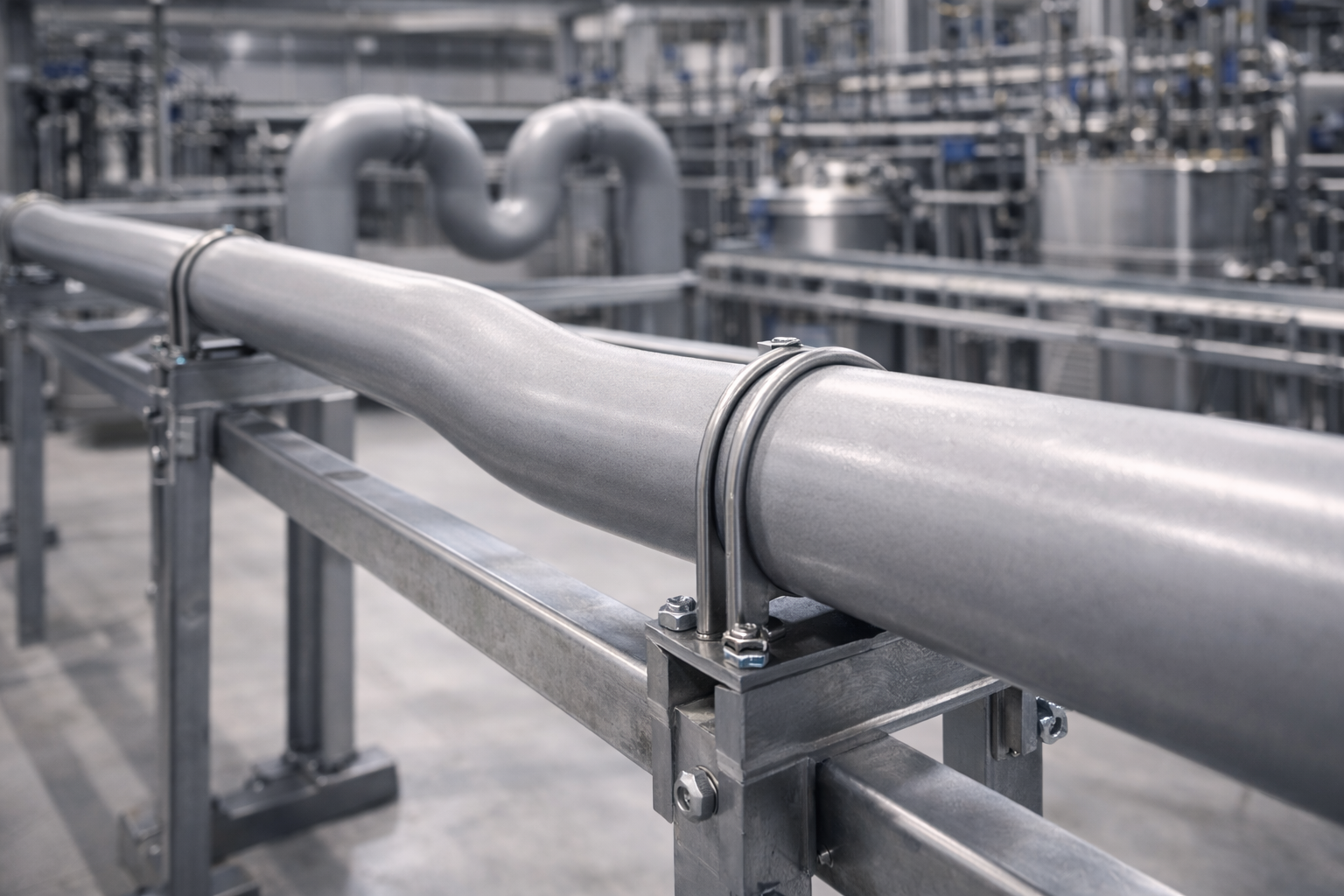 Hệ số giãn nở nhiệt tuyến tính của PP (~0,15 mm/m·°C) cao hơn thép khoảng 7–8 lần. Trong các tuyến ống dài, nếu không thiết kế đúng các đoạn bù giãn nở (expansion loops/offsets), ứng suất nhiệt có thể gây biến dạng hệ thống.