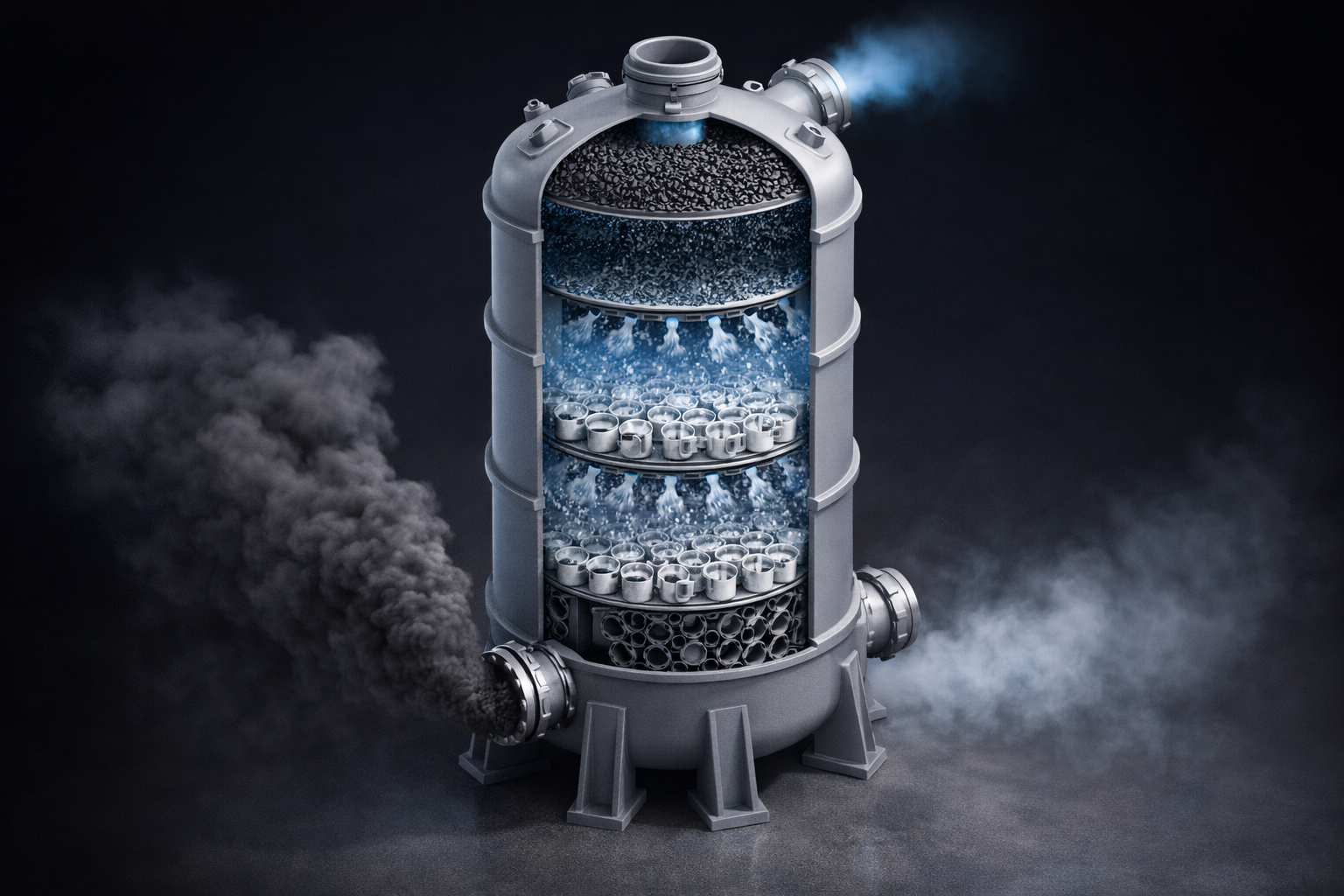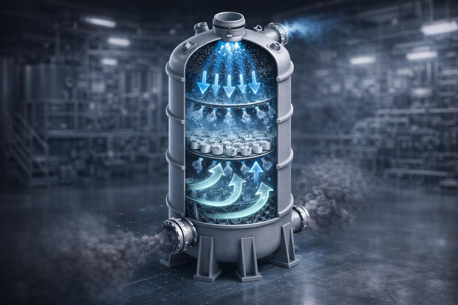 Tháp hấp thụ (Absorption Tower) trong bài viết này là thiết bị thực hiện quá trình hấp thụ ướt (wet absorption) — dùng dung dịch lỏng (thường là nước, NaOH, H₂SO₄, NaHCO₃) làm dung môi hấp thụ chất ô nhiễm khí.