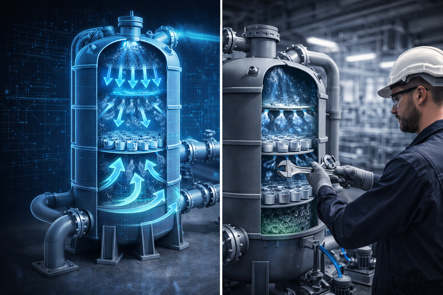 Mặc dù phổ biến như vậy, phần lớn kỹ sư vận hành và nhà đầu tư chỉ biết tháp hấp thụ “hút khí vào, phun nước hoặc kiềm, khí sạch ra ngoài” — mà chưa nắm vững cơ chế vật lý hóa học chi tiết, các yếu tố thiết kế quyết định hiệu suất, cũng như lý do tại sao hai tháp PP “trông giống nhau” nhưng một chiếc đạt hiệu suất 99%, một chiếc chỉ đạt 75%. Sự khác biệt đó nằm ở hiểu biết về truyền khối, thiết kế phân phối lỏng, lựa chọn đệm và cân bằng tải thủy lực — không phải ở ngoại hình tháp.