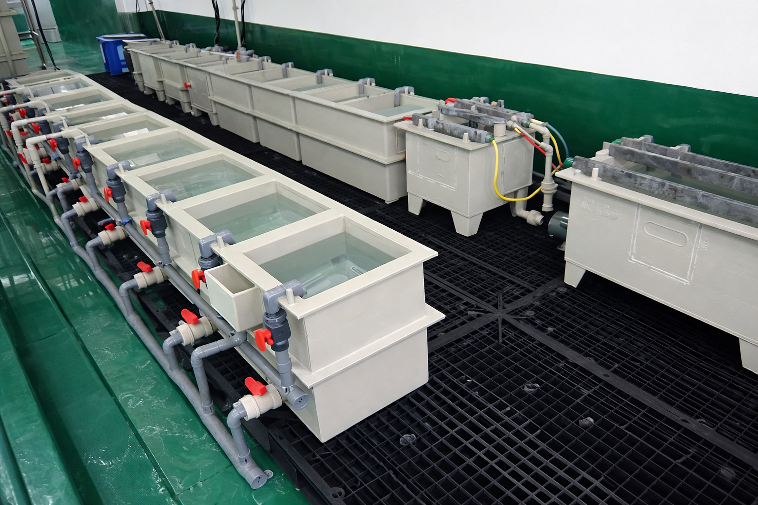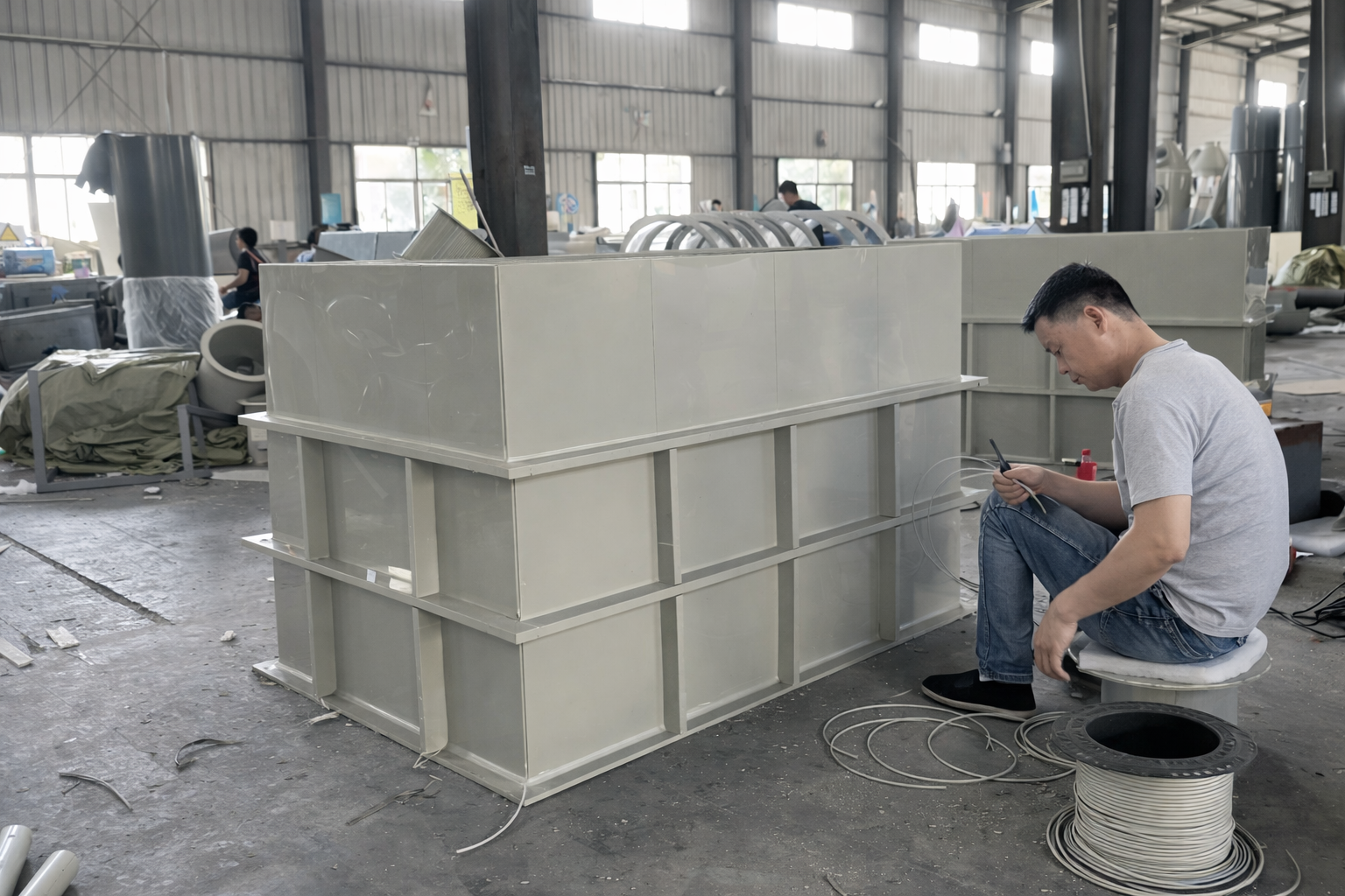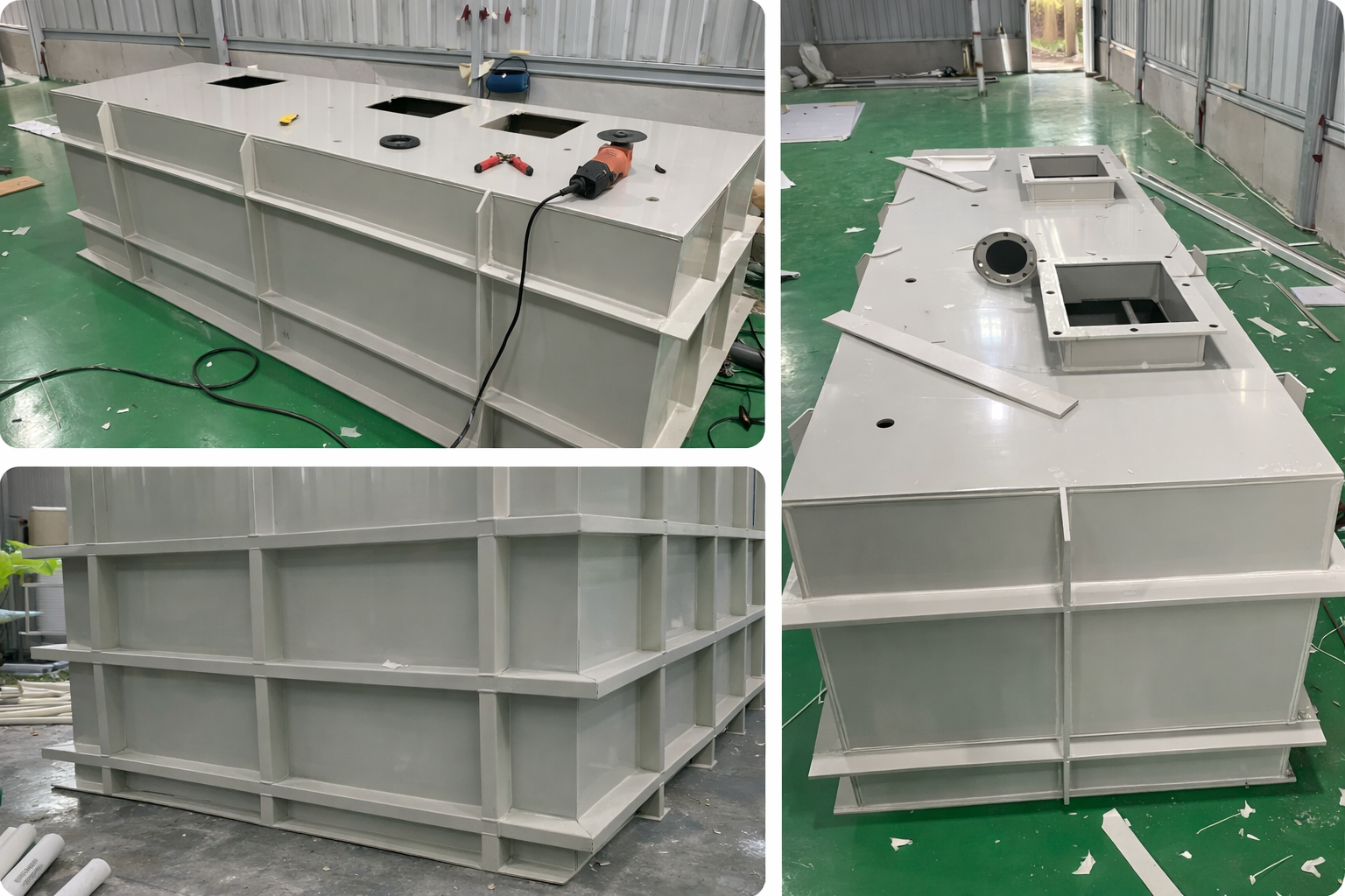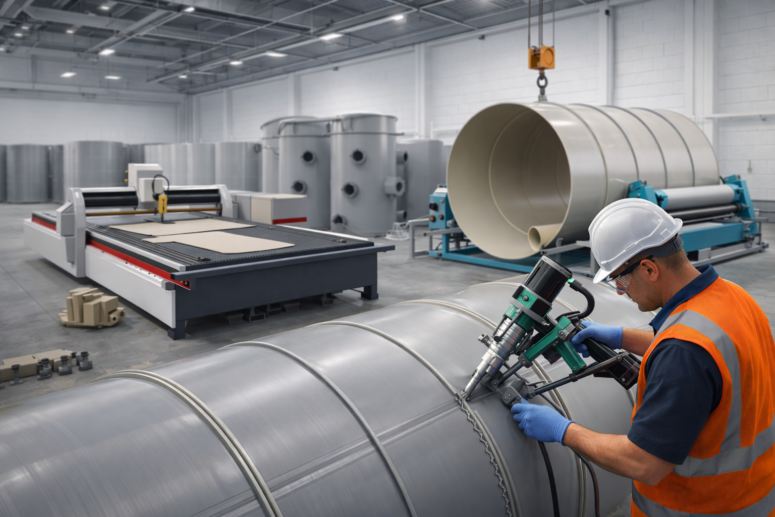 - Thiết bị gia công: máy cắt CNC nhựa, máy uốn tấm PP, súng hàn khí nóng điều chỉnh nhiệt độ số, máy hàn đùn chuyên nghiệp, buồng sấy tấm.