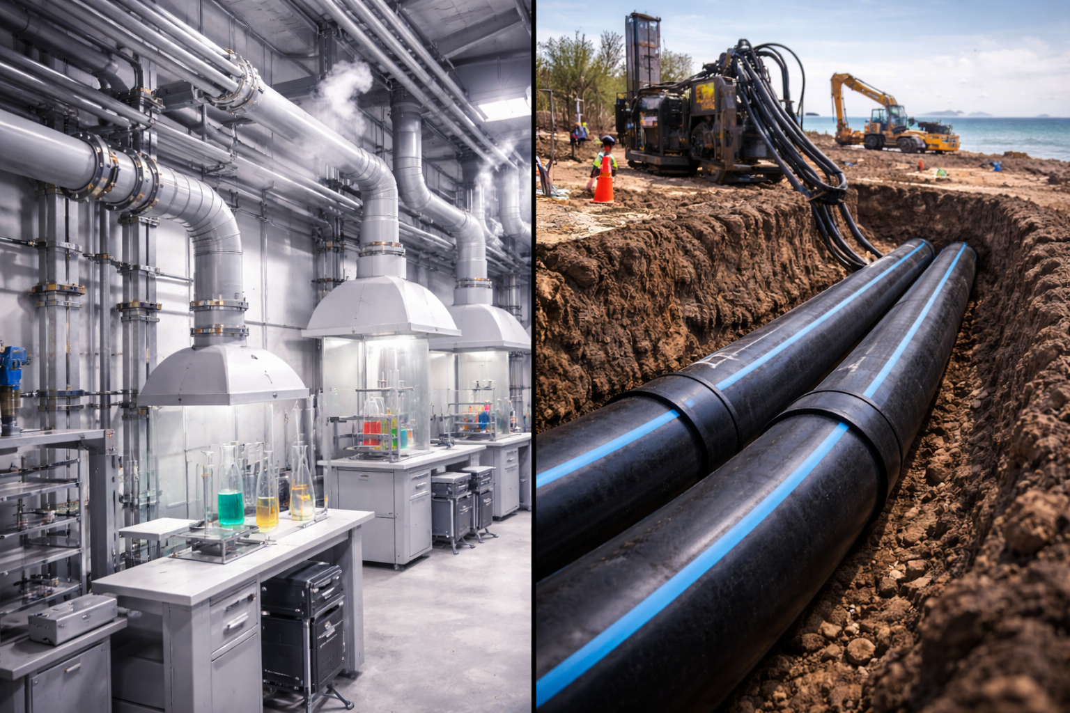 Trong thực tế, nhiều dự án hạ tầng quy mô lớn sử dụng kết hợp cả hai loại theo từng phân đoạn chức năng: HDPE cho tuyến ống áp lực chính chôn ngầm, PP cho hệ thống phân phối nội khu và đường ống hóa chất nội nhà máy.
