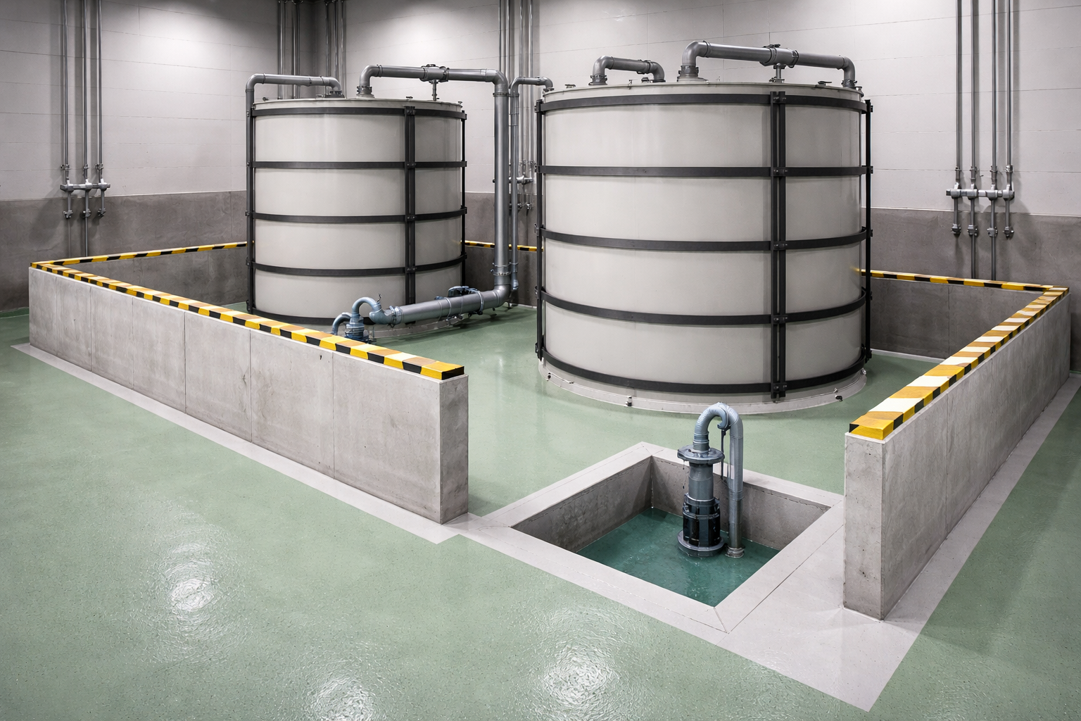 Đóng van cấp liệu đầu vào bể bị sự cố. Tắt bơm tuần hoàn. Đóng van cô lập đường ống kết nối bể với hệ thống. Đảm bảo dòng hóa chất mới không tiếp tục bổ sung vào điểm tràn đổ. Đánh giá nhanh: hóa chất rò rỉ có khả năng bốc lửa không? — nếu có, đảm bảo nguồn điện gần khu vực được cắt.