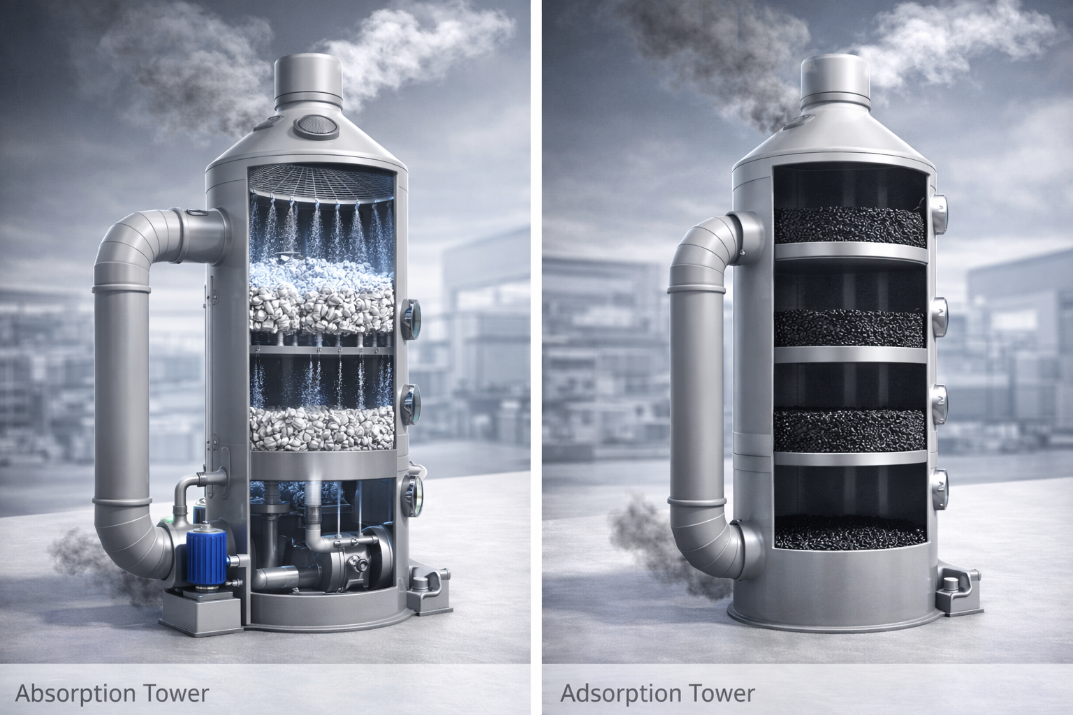Tháp hấp thụ (Absorption Tower / Wet Scrubber) và tháp hấp phụ (Adsorption Tower) là hai thiết bị xử lý khí thải có tên gọi dễ gây nhầm lẫn nhưng hoạt động theo nguyên lý vật lý-hóa học hoàn toàn khác nhau, phù hợp với các loại chất ô nhiễm và điều kiện vận hành đặc thù riêng biệt. Bài viết này phân tích chuyên sâu cơ chế tác động, cấu tạo thiết bị, thông số thiết kế, ưu-nhược điểm và tiêu chí lựa chọn của từng loại — cung cấp nền tảng kỹ thuật cho kỹ sư môi trường, kỹ sư quá trình và nhà quản lý sản xuất trong việc đưa ra quyết định công nghệ chính xác.