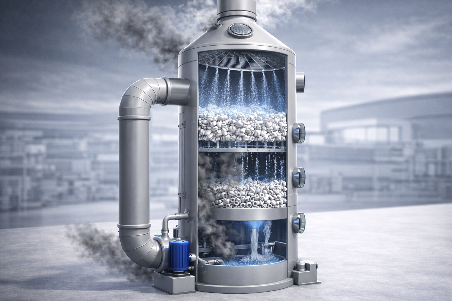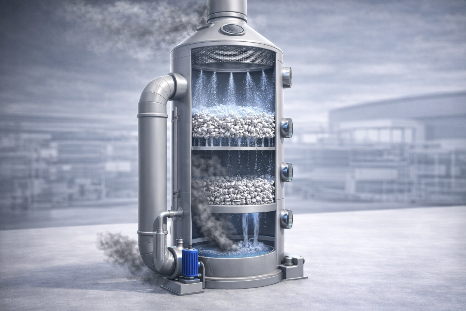 - Bể chứa và bơm tuần hoàn (Sump & Recirculation Pump): tuần hoàn dung dịch hấp thụ liên tục, bổ sung hóa chất tự động theo pH hoặc nồng độ, xả dung dịch thải khi cạn kiệt tác nhân phản ứng.