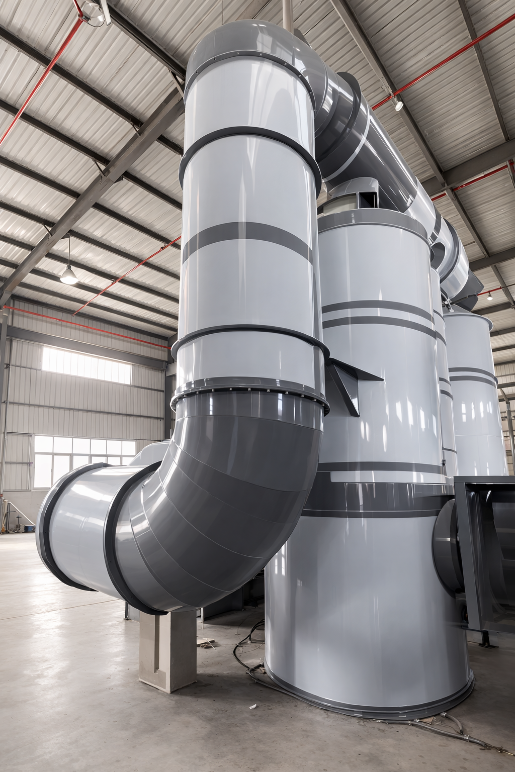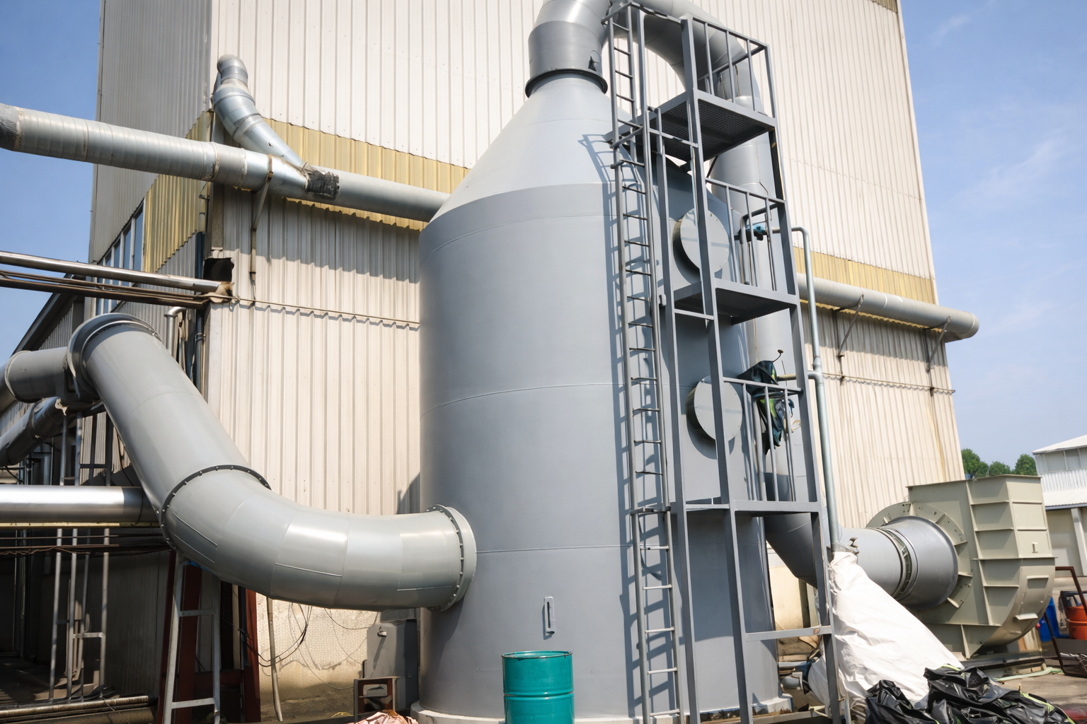 - Thân tháp (Tower Shell/Body): thường bằng nhựa PP, FRP (Fiberglass Reinforced Plastic), HDPE hoặc thép không gỉ 316L tùy tính ăn mòn của dòng khí thải. Hình trụ đứng, đường kính 200mm – 5.000mm tùy công suất xử lý.
