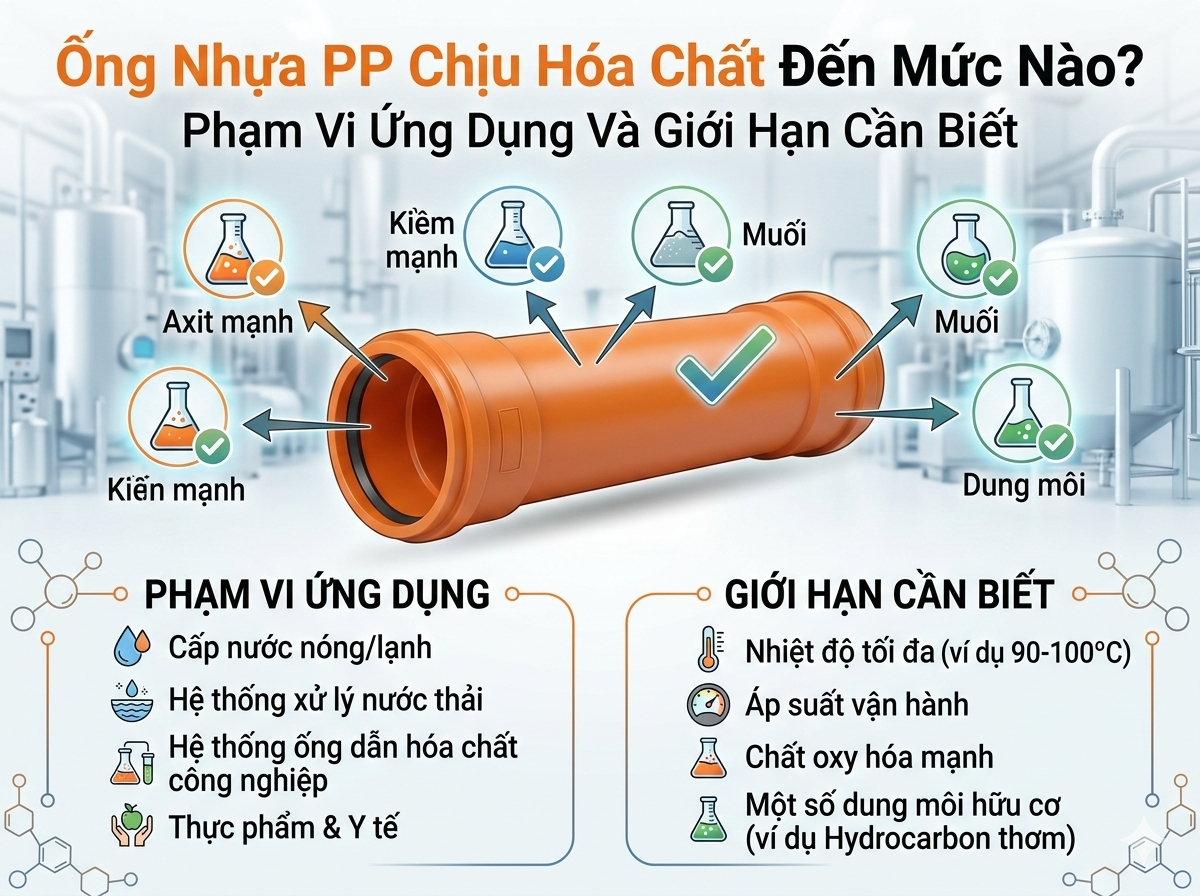 Trong các hệ thống dẫn hóa chất công nghiệp, ống nhựa PP (Polypropylene) thường được ...