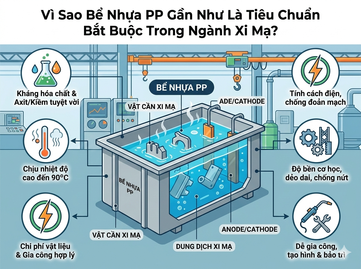 Bể nhựa PP (Polypropylene) được sử dụng rộng rãi trong ngành xi mạ, hóa chất, ...