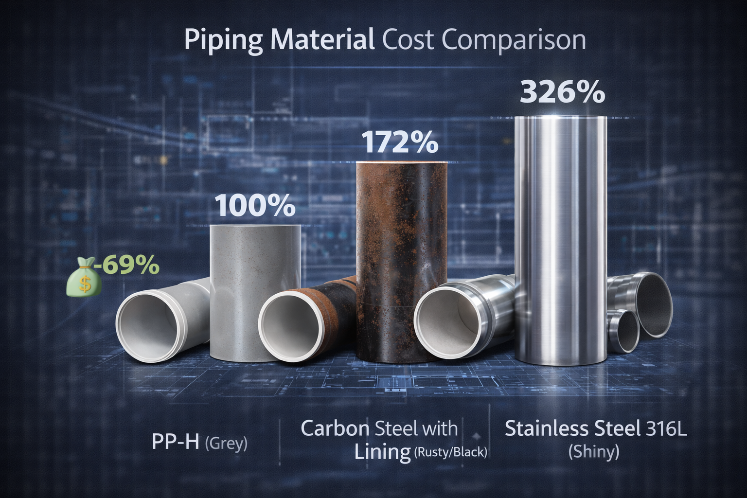 Nhận xét quan trọng: Khi so sánh công bằng — ống CS đã có đầy đủ lớp bảo vệ phù hợp cho môi trường acid ẩm (epoxy lining trong + ngoài, sơn cao nhiệt) — giá thực sự của ống CS không còn rẻ hơn ống PP. Ở DN200, ống CS có bảo vệ đầy đủ đắt hơn ống PP-H nội địa 20–40%.
