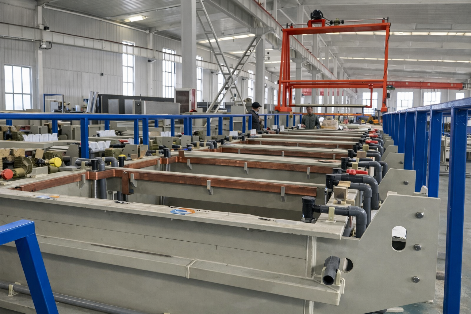 Giai đoạn 3 — Xử Lý Nước Thải Mạ (Wastewater Treatment): Nước thải xi mạ là hỗn hợp của tất cả dòng thải trên — pH dao động từ 0 đến 13, chứa Cr⁶⁺, CN⁻, Ni²⁺, Cu²⁺, Pb²⁺, Cd²⁺, Zn²⁺ cùng lúc. Hệ thống xử lý nước thải mạ phải kháng toàn dải pH này mà không thôi nhiễm thêm kim loại vào dòng thải đang cần làm sạch.