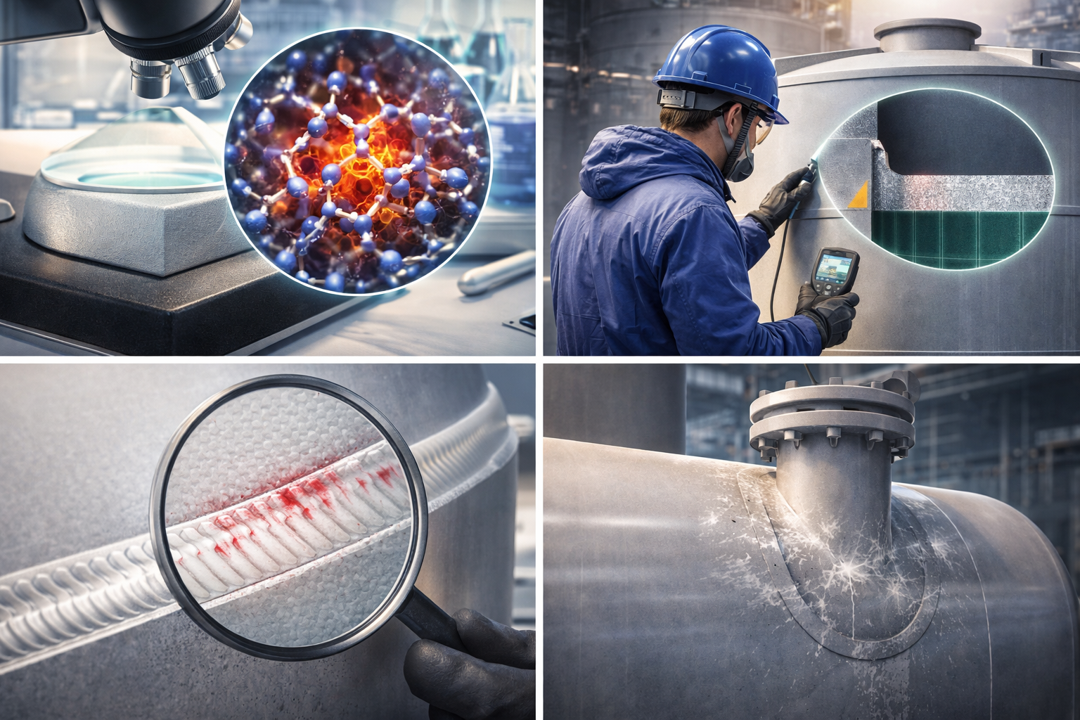 Mối hàn là điểm yếu nhất trong bồn PP — tập trung ứng suất nhiệt, ứng suất thủy lực, và là vùng OIT thường thấp hơn vùng nền do nhiệt khi hàn tiêu thụ một phần AO. Vi nứt tại mối hàn tăng trưởng theo thời gian và điều kiện vận hành theo một tốc độ có thể dự báo — nhưng chỉ khi đã phát hiện và đo kích thước từ đầu.