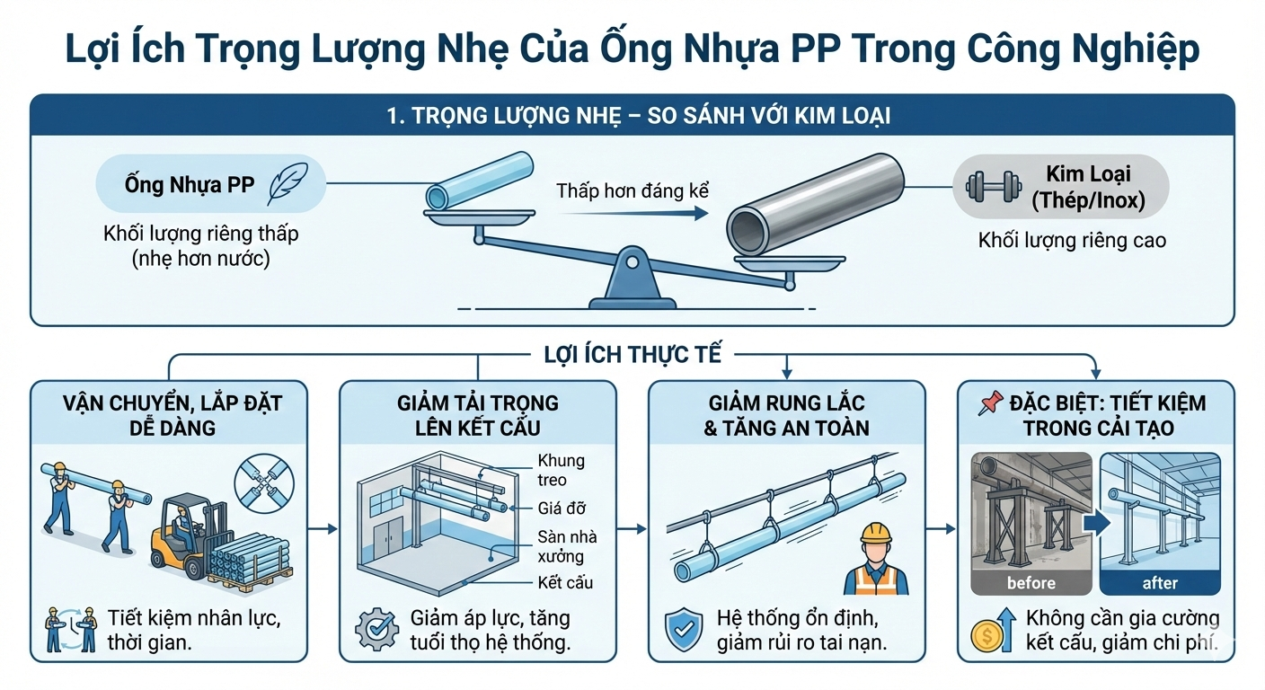 Ống nhựa PP có khối lượng riêng thấp hơn đáng kể so với kim loại như thép hay inox. Điều này mang lại nhiều lợi ích thực tế:
