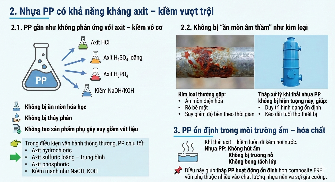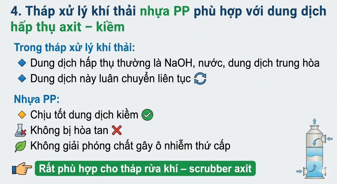 Vậy vì sao nhựa PP phù hợp với khí thải axit – kiềm hơn nhiều vật liệu khác?